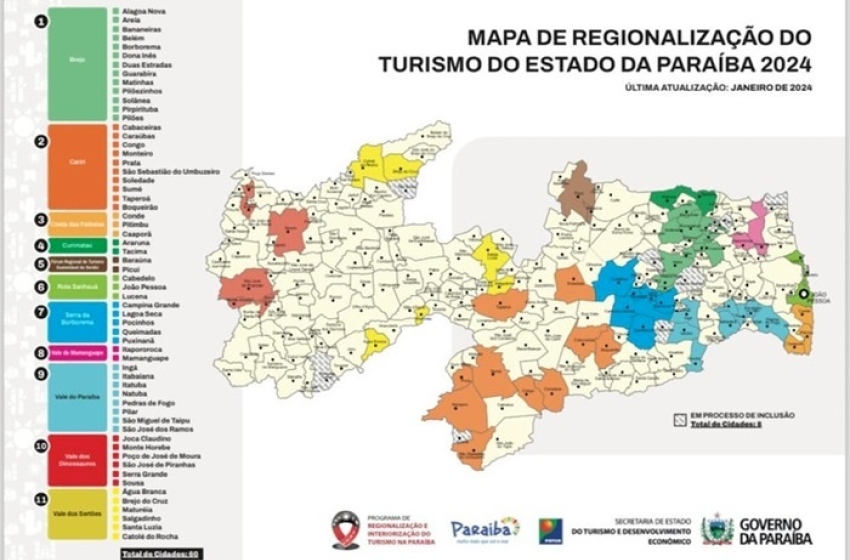 A edição 2024 do Mapa de Regionalização do Turismo paraibano tem 60 municípios distribuídos em 11 regiões turísticas, que em breve contarão com mais duas, contemplando cerca de 20 cidades no Litoral Norte e no Vale do Piancó. O mapa foi apresentado em Campina Grande junto com a nova logomarca do Programa do Turismo da Paraíba, durante o lançamento do Paraíbe-se.